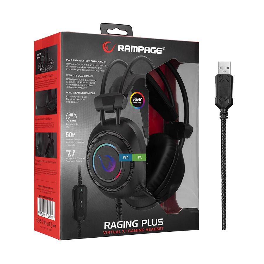 Slušalice sa mikrofonom gaming RAMPAGE RM-K19 RAGING PLUS Black USB 7.1 Version RGB Led Gaming Headset with Microphone, 32915
