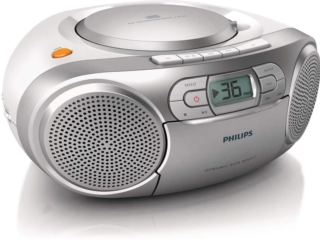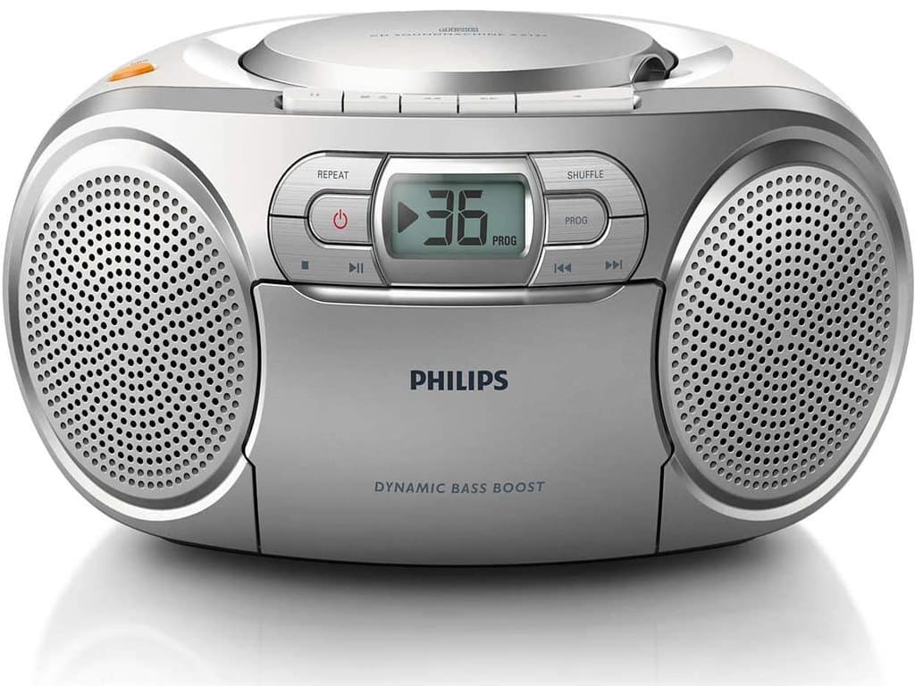 Philips CD Soundmachine; CD; CD-R; CD-RW; KASETEFON; FM Antena; Automatsko digitalno podesavanje; stereo; izlazna snaga (RMS) 2x1W; 2 zvucnika;audio ulaz (3,5mm); napajanje AC ili baterija; boja siva